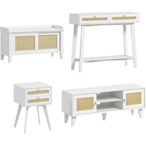 Renueva o muebla de nuevo tu sala de estar con este pack de muebles de 3 piezas de HOMCOM. La mesa de TV tiene una gran encimera, 2 baldas abiertas y 2 armarios, y admite teles de hasta 55 pulgadas. La mesa de consola cuenta con 2 cajones, un estante inferior y una encimera espaciosa. Y la mesita auxiliar dispone de 2 cajones para guardar libros y otros objetos.Características:Mesa de TV con encimera de 120 cm de ancho apta para televisores de hasta 55 pulgadas con 2 estantes abiertos y 2 armarios Consola de entrada con 2 cajones con frontales de rejilla y estante inferior Mesita auxiliar para tener junto al sofá con 2 cajones Con almohadillas antideslizantes para evitar rayones en el suelo Cajones con pomos para facilitar su apertura y cierre y frontales decorativos de rejilla de ratán Se requiere montajeEspecificaciones:Color: blanco Material: MDF, melamina de madera, ratán Medidas totales: 120x35x46 cm (LxANxAL)(mueble para TV) Carga máxima: 40 kg (total), 10 kg (encimera), 6 kg (estante inferior), 4 kg (estante intermedio) Medidas totales de la consola: 100x30x81 cm (LxANxAL) Carga máxima de la consola: 26 kg (total), 10 kg (encimera/estante), 3 kg (cajón) Medidas totales de la mesita: 40x40x60 cm (LxANxAL) Carga máxima de la mesita: 10 kg (total), 4 kg (encimera), 3 kg (cada cajón) Referencia: 839-P008El paquete incluye:● 1 x Mueble para TV (Referencia: 839-907V80WT) ● 1 x Mesa de consola (Referencia: 837-440V00WT) ● 1 x Mesita auxiliar (Referencia: 831-714V00WT) ● 3 x Manual de instrucciones